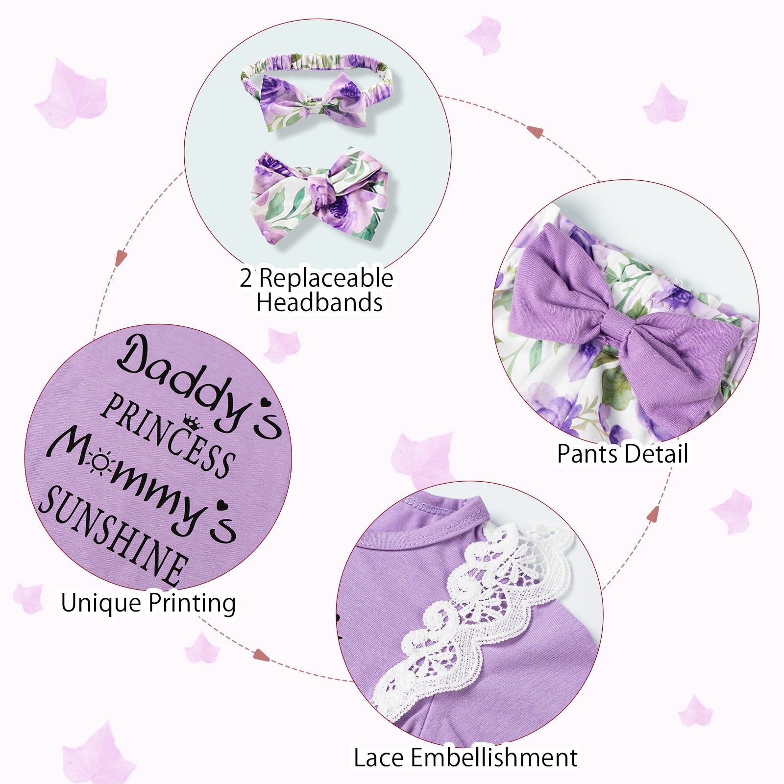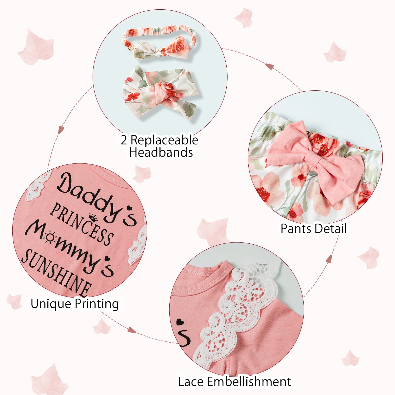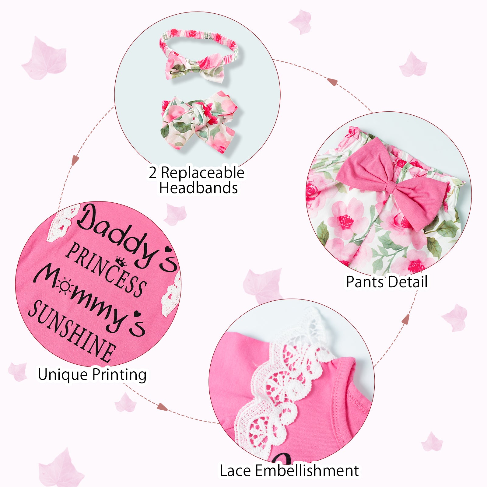 • 【Lovely Design】Toddler girl romper outfit is adorned with lace and printed with unique words, as well as buttons for easy diaper changing; the pants are designed with matching floral print, and the ruffles and bows at the waist are playful.