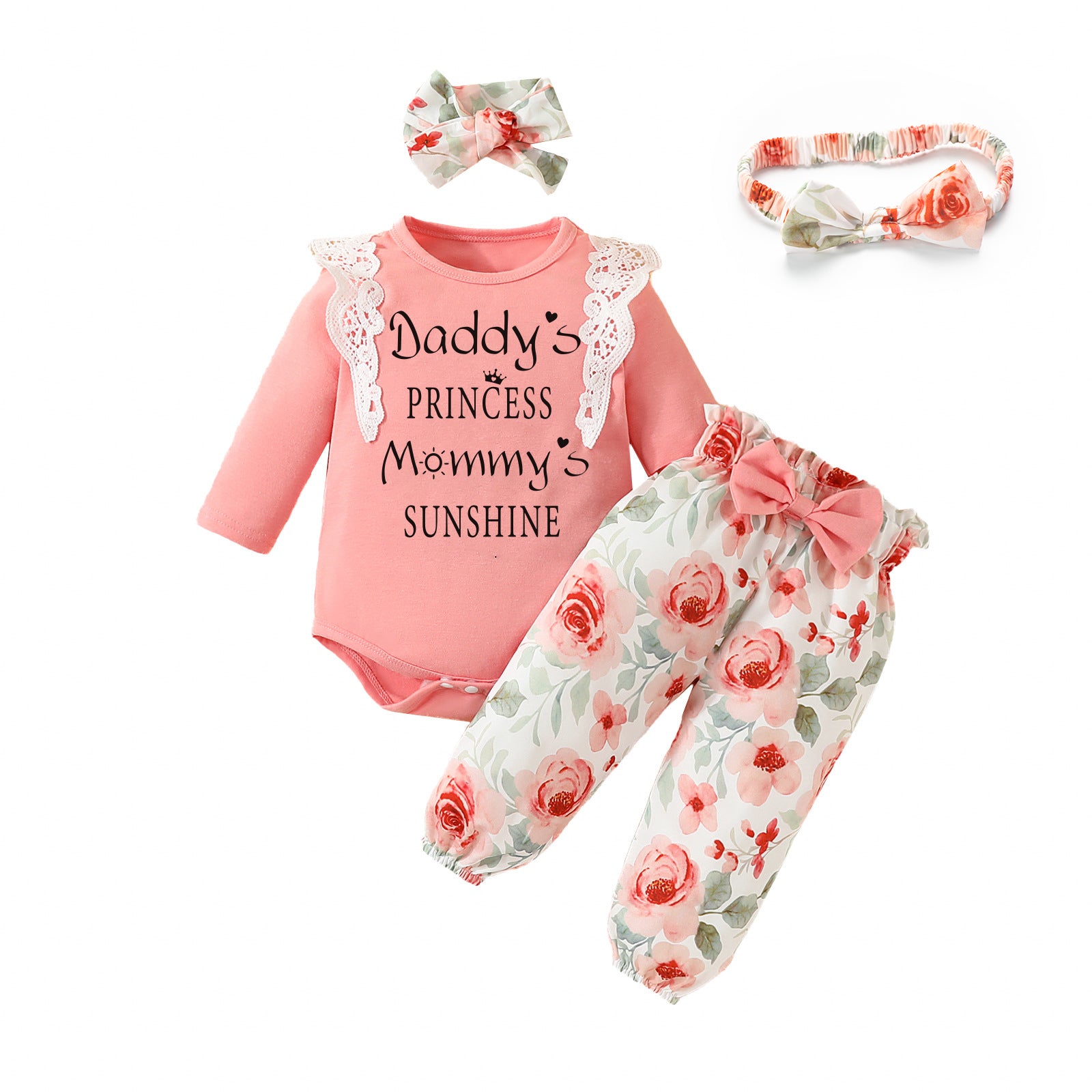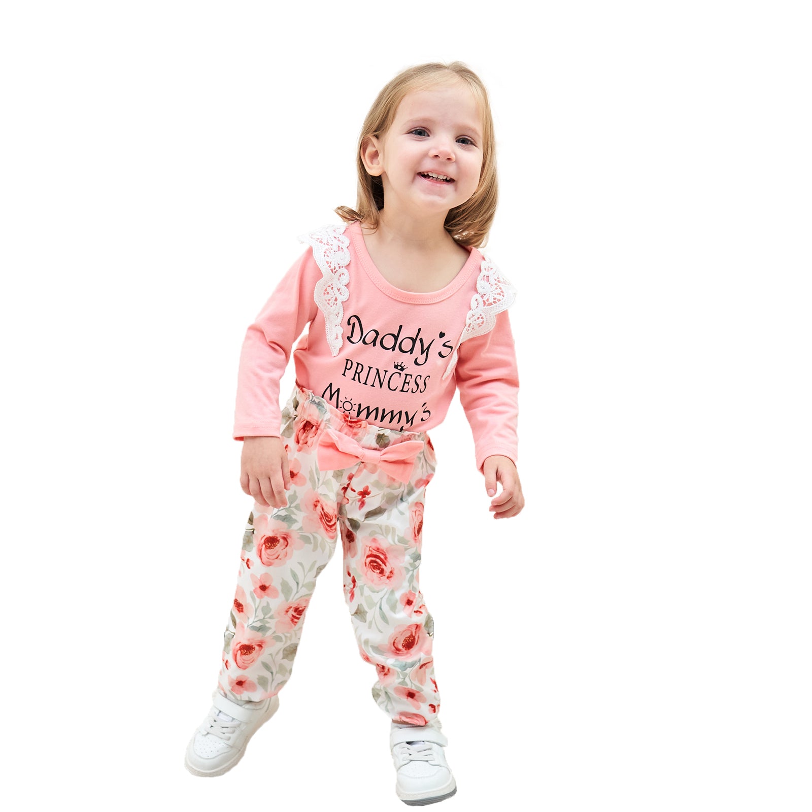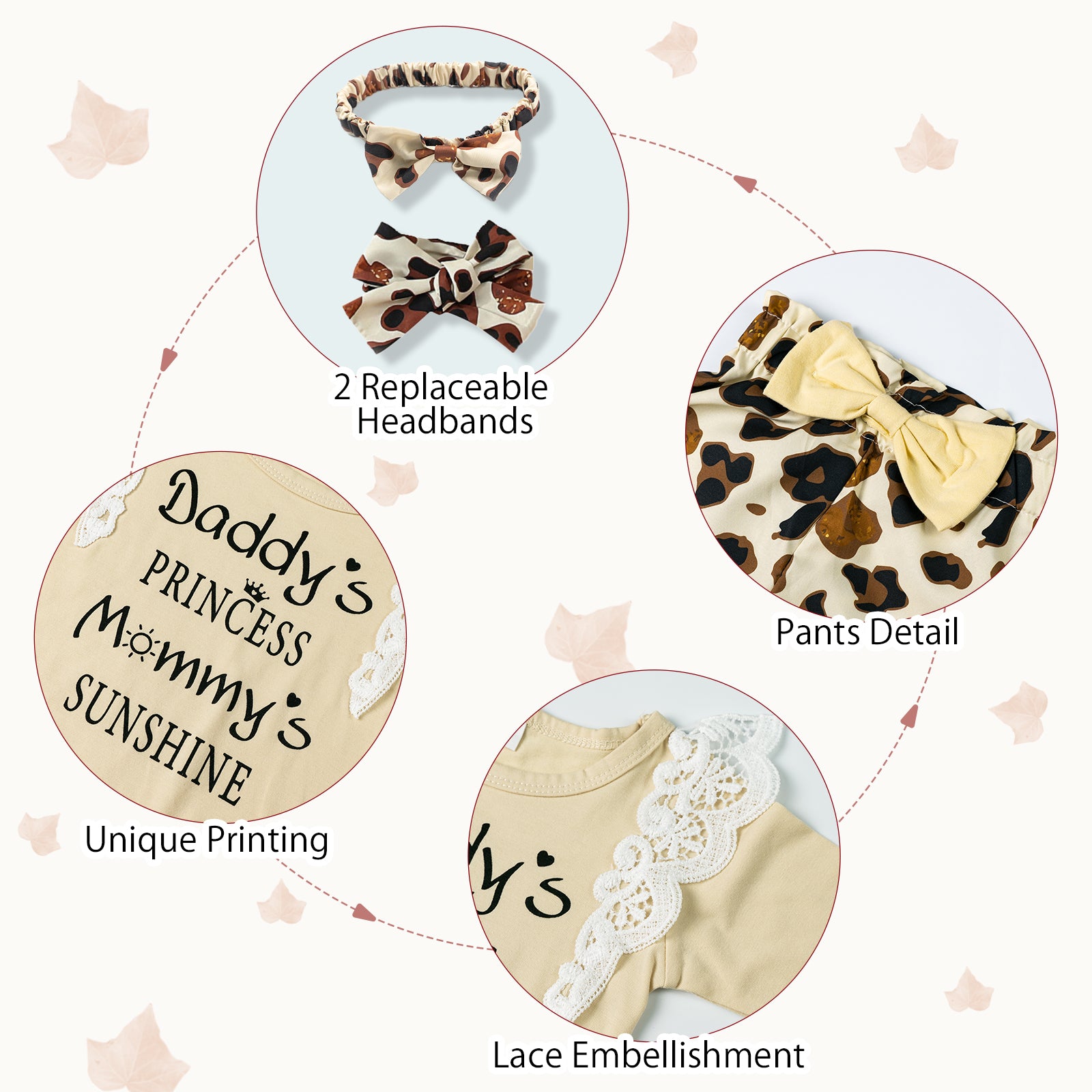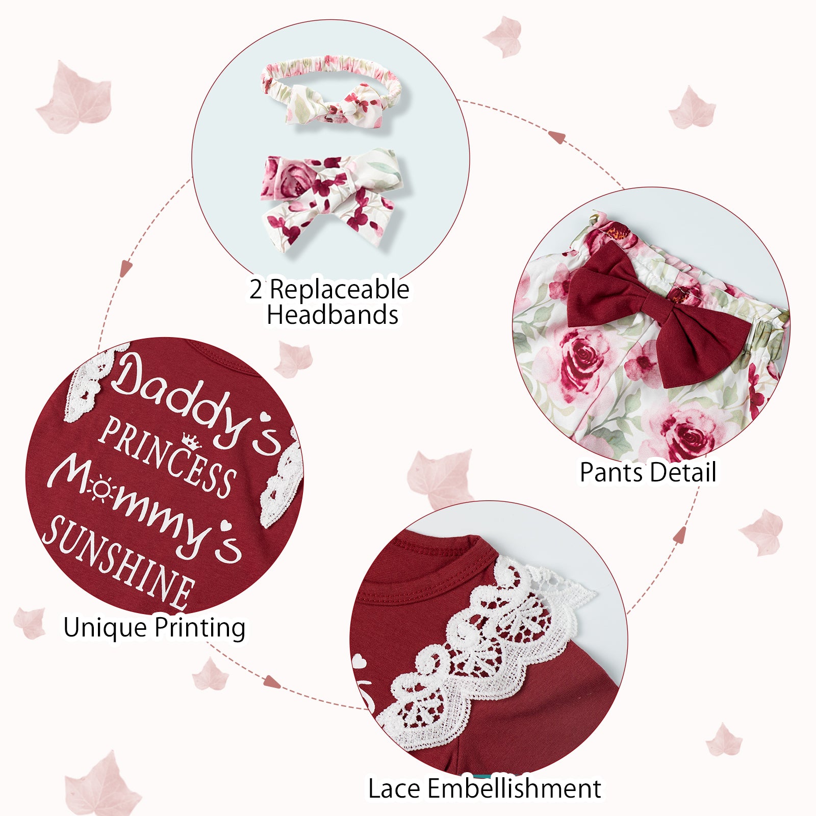 • 【Lovely Design】Toddler girl romper outfit is adorned with lace and printed with unique words, as well as buttons for easy diaper changing; the pants are designed with matching floral print, and the ruffles and bows at the waist are playful.